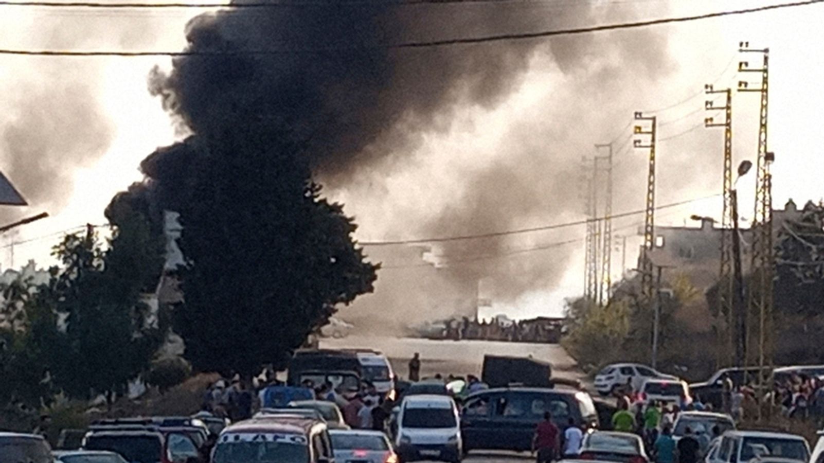 Rök stiger upp från explosionsplatsen i Libanon. At least 20 people were killed when a fuel tanker exploded in northern Lebanon on Sunday. Lebanese Red Cross reported at least 20 people were killed and at least 79 people were injured in the fuel tank explosion on August 15 2021.